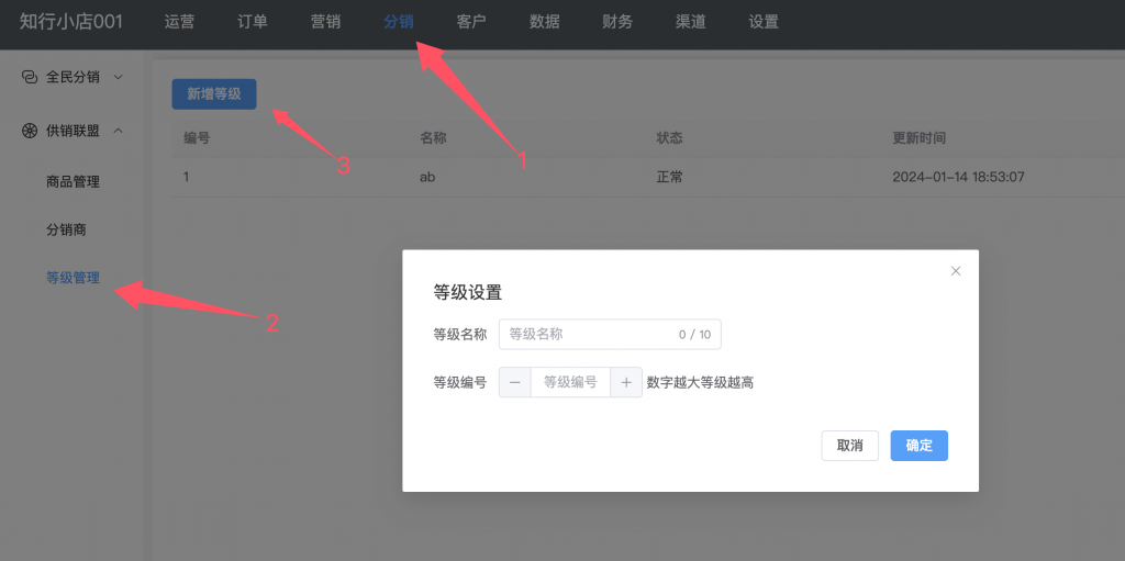 首先A商家登录我们后台,点击分销=>等级管理=>新增等级,在弹出框中设置等级名称等信息,然后点击确定,添加一个新的等级信息。