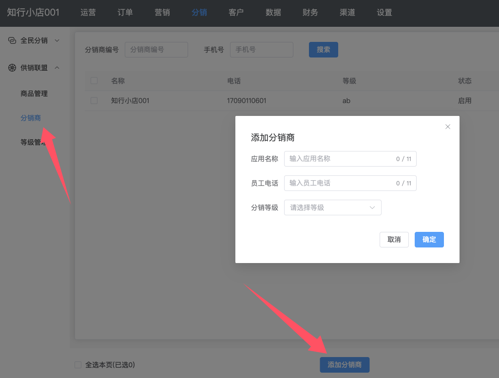设置好等级以后,点击左侧的分销商,点下面的添加分销商按钮,然后在弹出框中填写B商户的应用名字、电话、选择等级,然后点确定,这样两个商家就建立起来了关联关系。