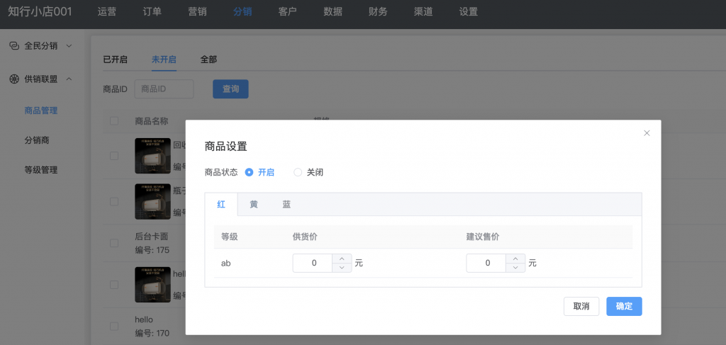 设置分销上之后,点击左侧的商品管理,选择未开启的商品,选择需要同步的商品,点击上架按钮。在弹出框中设置商品状态为开启,规格设置对应价格,然后点击确定按钮。这样商品就开放给了分销商。
