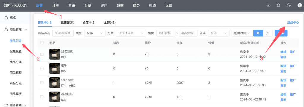B商户打开我们后台,点击运营=> 商品列表=>选品中心,进入选品中心页面。